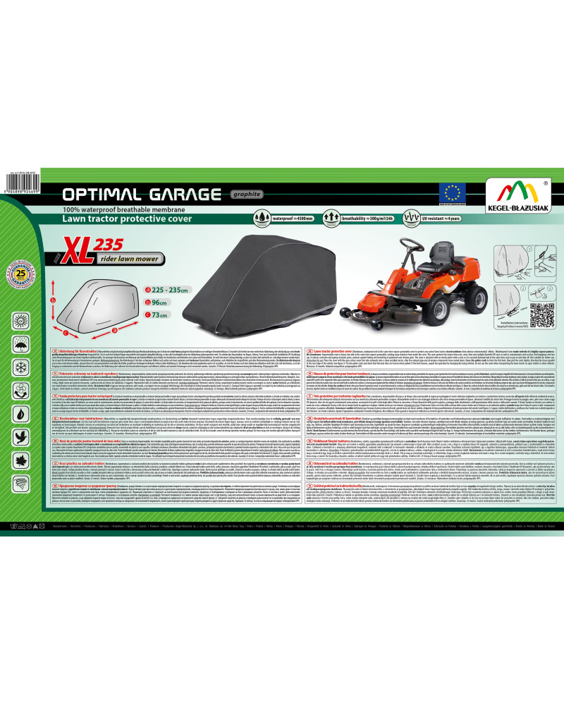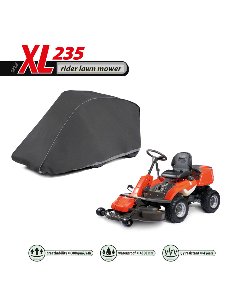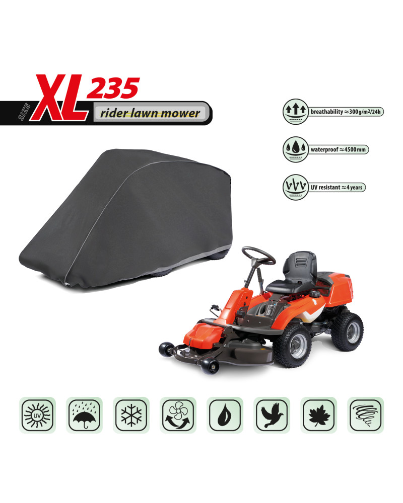 Całoroczny pokrowiec do ochrony samojezdnej kosiarki do trawy przechowywanej na zewnątrz przed niekorzystnym wpływem środowiska. Dzięki specjalnej konstrukcji woda podczas deszczu spływa po pokrowcu nie wnikając pod pokrowiec. Chroni kosiarkę przed deszczem, śniegiem, szronem i promieniami słonecznymi (szkodliwym UV) oraz zanieczyszczeniami jak pył, ptasie odchody i soki z drzew. Ogranicza korozję i starzenie się elementów z tworzyw sztucznych, chroni przed blaknięciem i matowieniem lakieru oraz elementów chromowanych. Pokrowiec jest w pełni odporny na wszystkie warunki atmosferyczne.