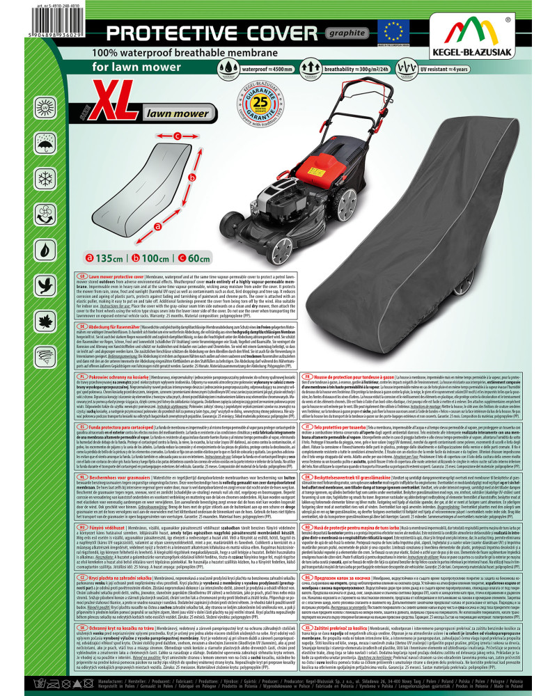 Membranowy, nieprzemakalny i jednocześnie paroprzepuszczalny pokrowiec do ochrony spalinowej kosiarki do trawy przechowywanej na zewnątrz przed niekorzystnym wpływem środowiska. Odporny na warunki atmosferyczne pokrowiec wykonany w całości z membrany wysokoparoprzepuszczalnej. Nieprzemakalny nawet podczas intensywnego deszczu i jednocześnie paroprzepuszczalny, odprowadzający na zewnątrz wilgoć spod pokrowca. Chroni kosiarkę przed deszczem, śniegiem, szronem i promieniami słonecznymi (szkodliwym UV) oraz zanieczyszczeniami jak pył, ptasie odchody i soki z drzew. Ogranicza korozję i starzenie się elementów z tworzyw sztucznych, chroni przed blaknięciem i matowieniem lakieru oraz elementów chromowanych.