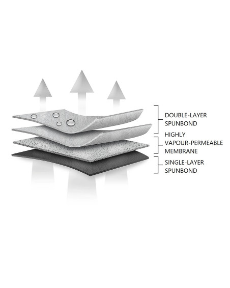 Dzięki specjalnej konstrukcji, para wodna i wilgoć są stale odprowadzane na zewnątrz, a woda podczas deszczu spływa po bocznych ścianach pokrowca, nie wnikając pod pokrowiec.