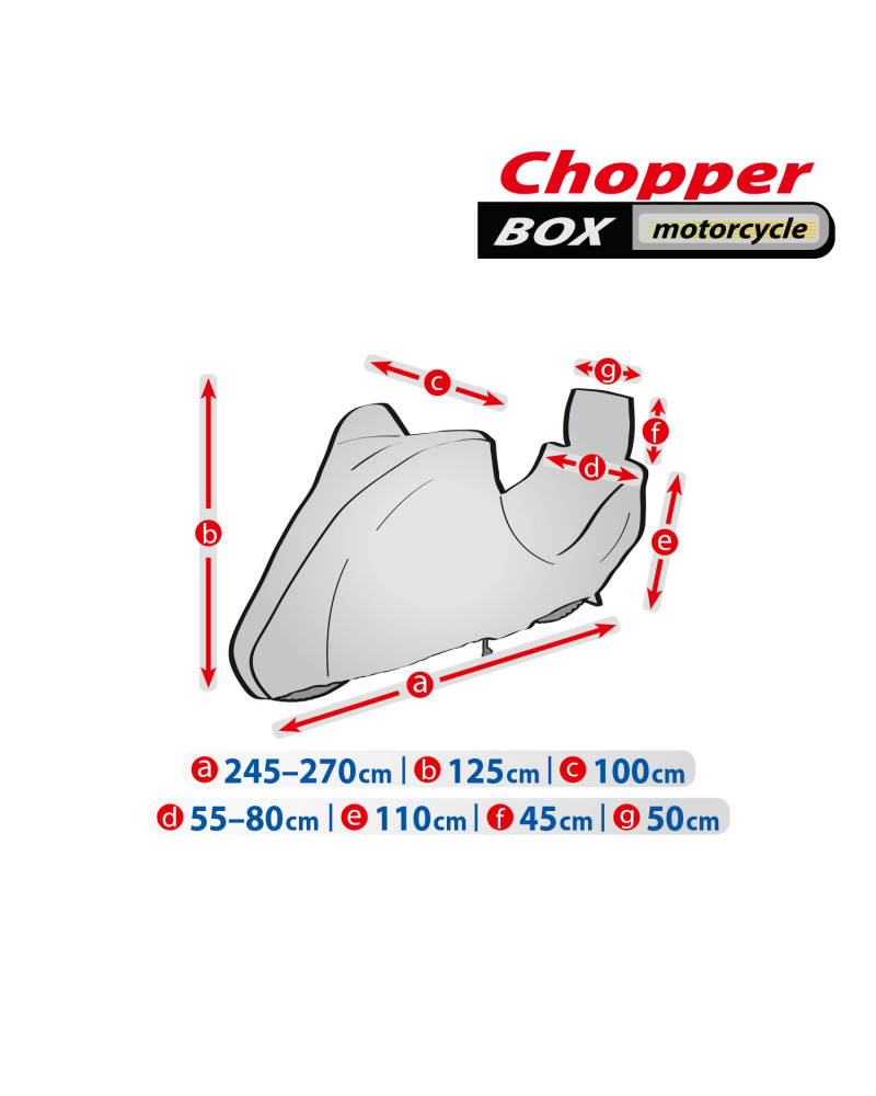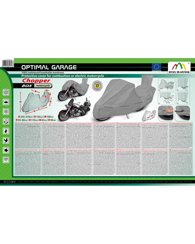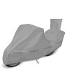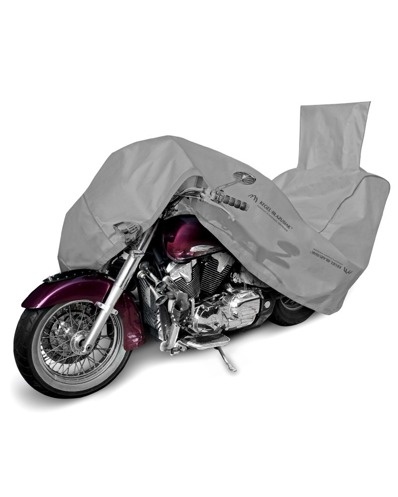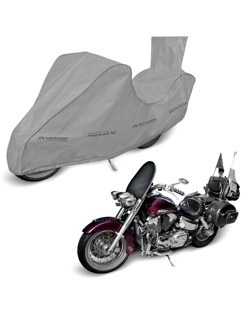 Membranowy, nieprzemakalny i jednocześnie paroprzepuszczalny pokrowiec do ochrony motocykla spalinowego lub elektrycznego przed niekorzystnym wpływem środowiska. Odporny na warunki atmosferyczne pokrowiec wykonany w całości z membrany wysokoparoprzepuszczalnej. Nieprzemakalny nawet podczas intensywnego deszczu i jednocześnie paroprzepuszczalny, odprowadzający na zewnątrz wilgoć spod pokrowca. Chroni przed deszczem, śniegiem, szronem i promieniami słonecznymi (szkodliwym UV) oraz zanieczyszczeniami jak pył, ptasie odchody i soki z drzew. Ogranicza korozję i starzenie się elementów z tworzyw sztucznych, chroni przed blaknięciem i matowieniem lakieru oraz elementów chromowanych. Odpowiedni do długo lub krótkookresowego przechowywania na zewnątrz pomieszczeń motocykla spalinowego lub krótkookresowego przechowywania motocykla elektrycznego. Odpowiedni także do użytku wewnątrz pomieszczeń. Ściągacz z linką i dodatkowe zapięcia pod motocyklem zabezpieczają pokrowiec przed zerwaniem przez wiatr.