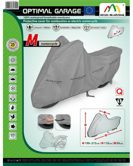 Membranowy, nieprzemakalny i jednocześnie paroprzepuszczalny pokrowiec do ochrony motocykla spalinowego lub elektrycznego przed niekorzystnym wpływem środowiska. Odporny na warunki atmosferyczne pokrowiec wykonany w całości z membrany wysokoparoprzepuszczalnej. Nieprzemakalny nawet podczas intensywnego deszczu i jednocześnie paroprzepuszczalny, odprowadzający na zewnątrz wilgoć spod pokrowca. Chroni przed deszczem, śniegiem, szronem i promieniami słonecznymi (szkodliwym UV) oraz zanieczyszczeniami jak pył, ptasie odchody i soki z drzew. Ogranicza korozję i starzenie się elementów z tworzyw sztucznych, chroni przed blaknięciem i matowieniem lakieru oraz elementów chromowanych. Odpowiedni do długo lub krótkookresowego przechowywania na zewnątrz pomieszczeń motocykla spalinowego lub krótkookresowego przechowywania motocykla elektrycznego. Odpowiedni także do użytku wewnątrz pomieszczeń. Ściągacz z linką i dodatkowe zapięcia pod motocyklem zabezpieczają pokrowiec przed zerwaniem przez wiatr.