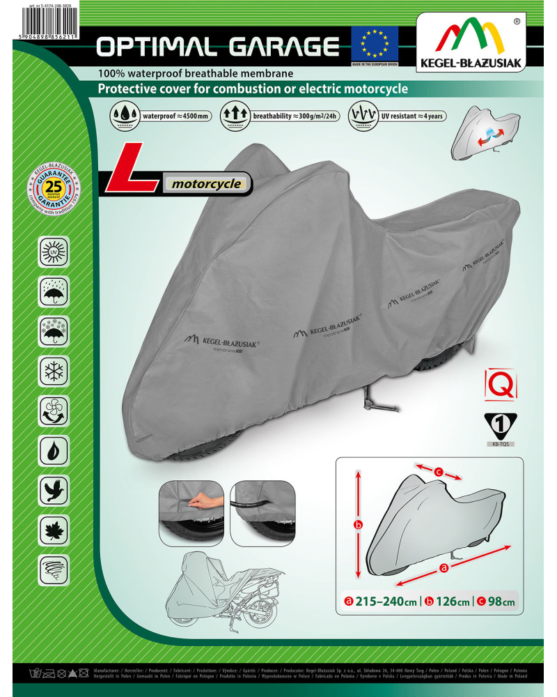Membranowy, nieprzemakalny i jednocześnie paroprzepuszczalny pokrowiec do ochrony motocykla spalinowego lub elektrycznego przed niekorzystnym wpływem środowiska. Odporny na warunki atmosferyczne pokrowiec wykonany w całości z membrany wysokoparoprzepuszczalnej. Nieprzemakalny nawet podczas intensywnego deszczu i jednocześnie paroprzepuszczalny, odprowadzający na zewnątrz wilgoć spod pokrowca. Chroni przed deszczem, śniegiem, szronem i promieniami słonecznymi (szkodliwym UV) oraz zanieczyszczeniami jak pył, ptasie odchody i soki z drzew. Ogranicza korozję i starzenie się elementów z tworzyw sztucznych, chroni przed blaknięciem i matowieniem lakieru oraz elementów chromowanych. Odpowiedni do długo lub krótkookresowego przechowywania na zewnątrz pomieszczeń motocykla spalinowego lub krótkookresowego przechowywania motocykla elektrycznego. Odpowiedni także do użytku wewnątrz pomieszczeń. Ściągacz z linką i dodatkowe zapięcia pod motocyklem zabezpieczają pokrowiec przed zerwaniem przez wiatr.