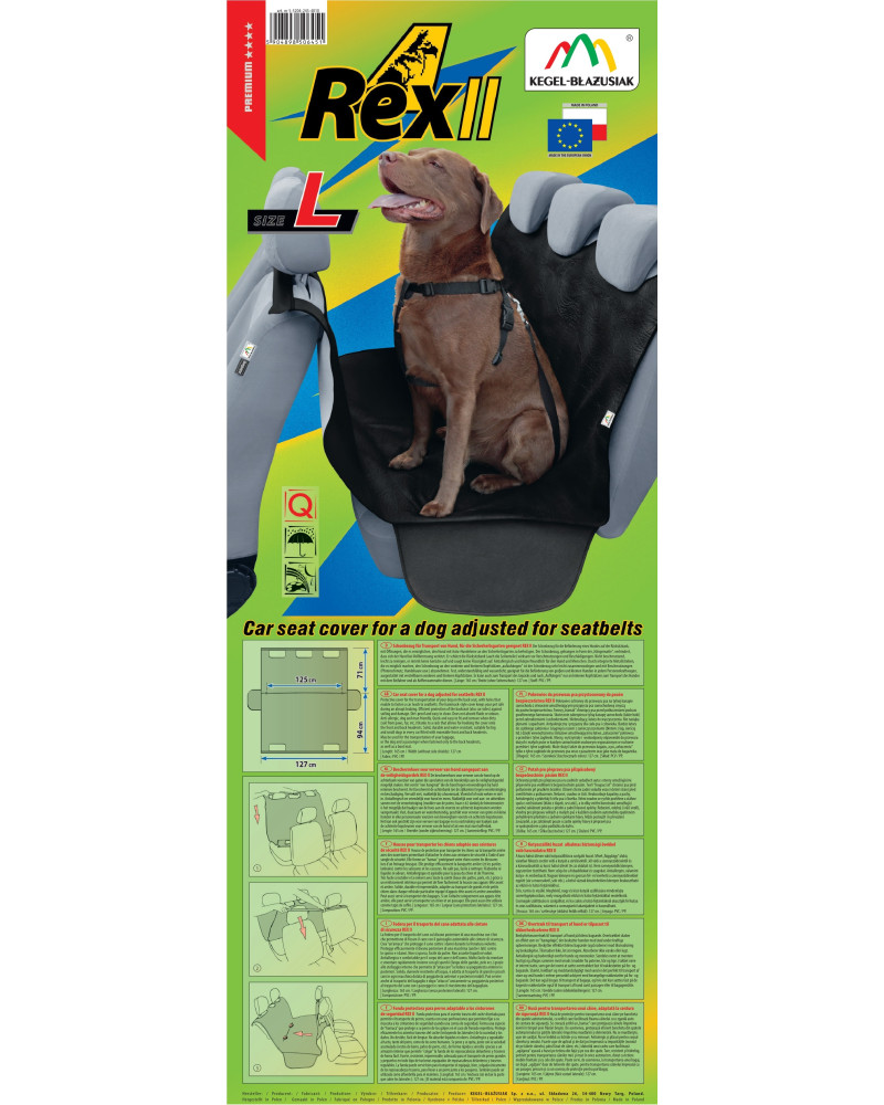 Mata samochodowa dla psa REX II to niezwykle praktyczny produkt, przeznaczony do przewożenia psa lub bagażu na tylnej kanapie samochodu. Posiada otwory, umożliwiające przypięcie psa samochodową smyczą do pasów bezpieczeństwa. Ponadto tworzy swoisty hamak pomiędzy tylną kanapą i przednimi siedzeniami. Pozwala to bezpiecznie przewozić psa, chroniąc go przed gwałtownym hamowaniem i innymi wstrząsami spowodowanymi jazdą. Chroni tapicerkę samochodu przed błotem, brudem, sierścią i różnego rodzaju zarysowaniami, spowodowanymi przewożeniem psa lub różnych nietypowych przedmiotów na tylnym siedzeniu. Dzięki sporej powierzchni i dodatkowo wszytym „skrzydłom” bocznym, osłania całą tylną kanapę wraz z jej bokami, które również są narażone na uszkodzenia, głównie podczas wchodzenia psa do samochodzu. Materiał z którego wykonany jest pokrowiec, jest wodoodporny a ponadto nie przepuszcza brzydkich zapachów.