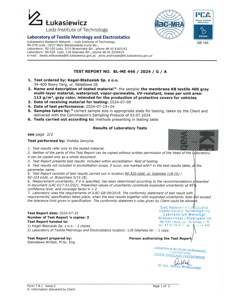 Poniżej raport z badań paroprzepuszczalności membrany z której produkujemy pokrowiec w górnej części. Badanie zostało wykonane w niezależnym labortorium badawczym. Badanie potwierdza wysoką paroprzepuszczalność i wodoszczelność membrany: przenikanie pary wodnej przez membranę pokrowca 161 gramów pary wodnej przez m² membrany w ciągu 24 godzin, wodoszczelność membrany 5350 mm słupa wody.