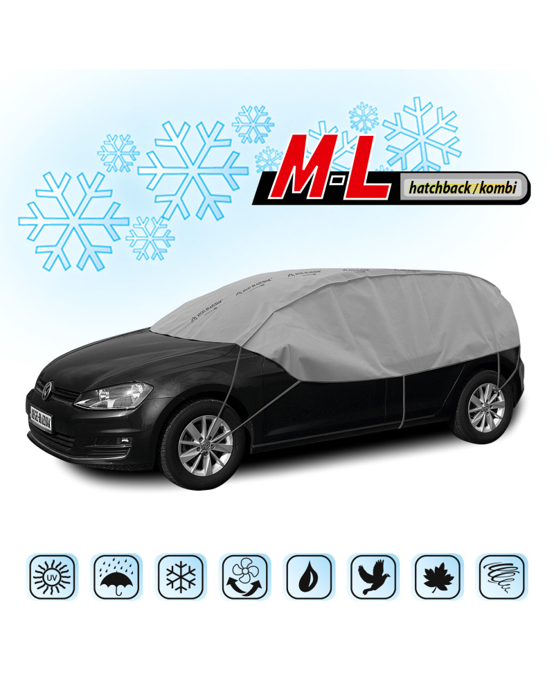 Dobrej jakości materiał jest trwały i mocny. Pokrowce mają kolor popielaty, który jest niezwykle praktyczny a zarazem świetnie się prezentuje. Produkt przystosowany zarówno do doraźnego jak i długotrwałego stosowania. Stworzone z myślą o właścicielach samochodów, którzy nie mają możliwości garażowania, pozostawiają dłużej swój samochód na powietrzu. Produkt bardzo łatwy i szybki w montażu. Wystarczy elastyczne pętle pokrowca zakończone bezpiecznymi hakami zahaczyć odpowiednio o felgi, dolną krawędź w środkowej części samochodu i o dolną krawędź tylnego zderzaka (instrukcja montażu poniżej). Pokrowiec trzyma się mocno samochodu i nie przemieszcza się nawet podczas porwistego wiatru. Po złożeniu pokrowiec nie zajmuje dużo miejsca, przez co zawsze można wozić go ze sobą.