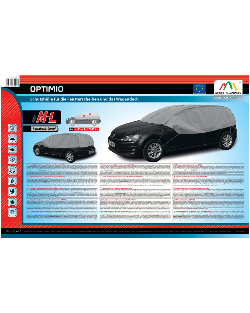Półplandeki ochronne OPTIMIO, ochronią w zimie dach, szyby i lusterka zaparkowanego samochodu przed osadzającym się szronem i śniegiem. Osłonią klamki i zamki samochodu, zapobiegając ich zamarzaniu. Nie przymarzną do samochodu. Ochronią także przed sokami z drzew, ptasimi odchodami i osadzającymi się pyłami, a nawet promieniami UV. Dlatego możemy stosowac je o każdej porze roku.