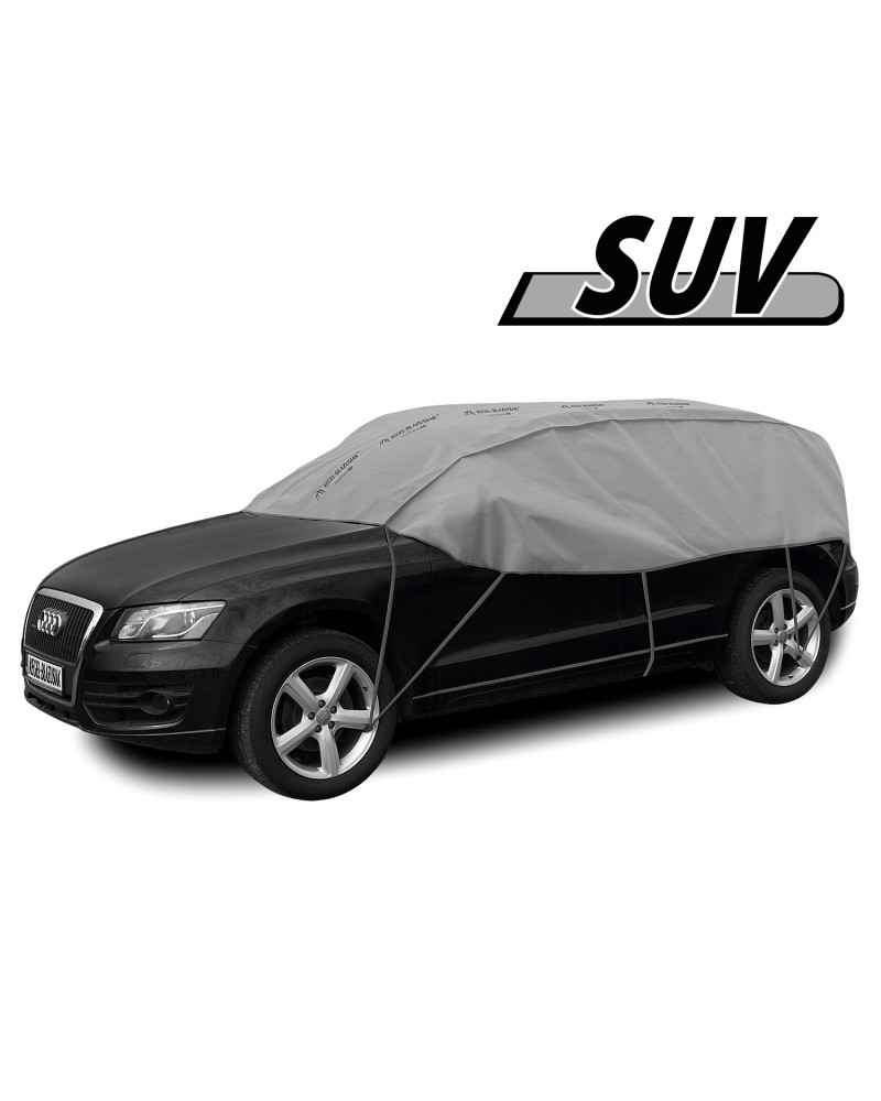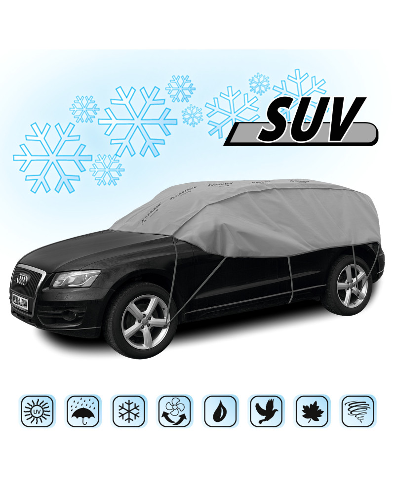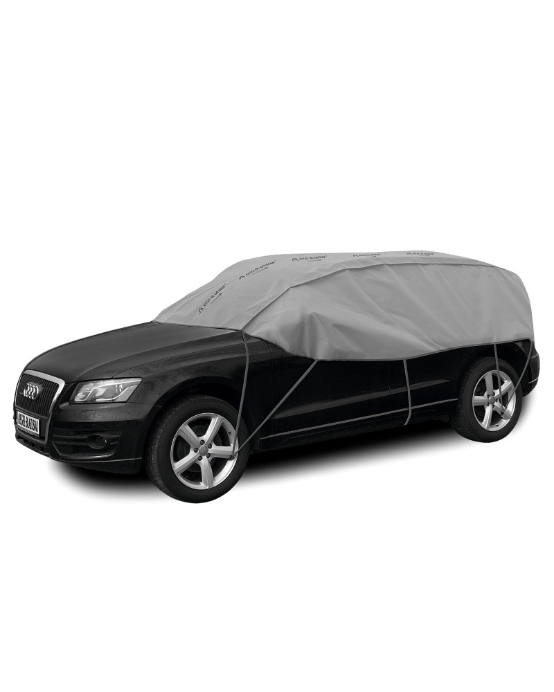 Górna część pokrowca (osłaniający dach oraz przednią i tylna szybę) jest wykonana aż z 4-warstwowego materiału, który jest gruby, mocny i wytrzymały. Nie przemaka, jednocześnie odprowadzając wilgoć spod pokrowca. Gładki SPUNBOND od wewnątrz, nie rysuje pojazdu.