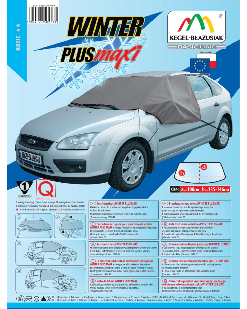 Niezwykle praktyczna osłona, chroniąca przednią szybę, boczne szyby i lusterka zaparkowanego samochodu przed osadzającym się szronem, lodem, śniegiem. Ponadto zapobiega zamrażaniu zamków. Osłona skutecznie zabezpieczy wskazane części samochodu a Tobie zapewni komfort i wygodę. Zaoszczędź dużo czasu, uchroń się od żmudnego zeskrobywania szronu z szyb, zachowaj energię na cały dzień – zastosuj osłonę WINTER PLUS maxi. Osłona zrobiona jest z wysokogatunkowego materiału SPUNBOND- bardzo mocnego, wytrzymałego a przede wszystkim odpornego na przymarzanie. Bardzo łatwo zakłada się ją i ściąga, bardzo prosto czyści. Dla Twojego samochodu i dla Ciebie!
