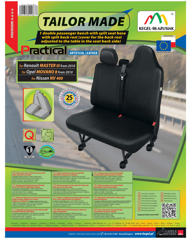 Nieprzemakalny, niebrudzący i niezwykle wytrzymały materiał zapewnia praktyczny użytek. Oferta skierowana do właścicieli samochodów dostawczych i mikrobusów, którzy chcą zadbać o wnętrze swoich pojazdów oraz dodać im szyku i elegancji. Stonowana, uniwersalna kolorystyka idealnie dopasowuje się do wnętrza każdego pojazdu. Pokrowce świetnie prezentują się w każdym samochodzie. Są wyjątkowo eleganckie, dlatego też dzięki nim każde wnętrze nabierze klasy i wdzięku. Pokrowce wyposażone są w niezbędne, zapinane otwory umożliwiające założenie pokrowca bez konieczności wyciągania zagłówków i wykonywania dodatkowych otworów. Przystosowane do samochodów posiadających pełny pas bezpieczeństwa, wychodzący z podwójnej kanapy pasażerów. Komplet wyposażony jest w specjalne klamerki montażowe, a do materiału wszyte są mocowania, dlatego tez bardzo łatwo go założyć. Wszelkie zabrudzenia pokrowca, są bardzo łatwe do usunięcia- wystarczy przetrzeć je wilgotną ścierką. Produkt renomowanej firmy Kegel-Błażusiak. Największego producenta i eksportera w branży pokrowców samochodowych i odzieży roboczej. Lata doświadczenia i coraz bardziej doskonały asortyment sprawiają, że pokrowce tejże marki można określić mianem najlepszych w Polsce. Produkowany w Polsce, głównie z polskich surowców z zachowaniem wszystkich standardów jakościowych Unii Europejskiej. Kupując pokrowce Kegel-Błażusiak wspierasz polską gospodarkę i chronisz polskie miejsca pracy.
