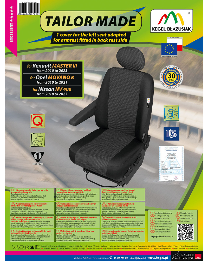 Zaletą pokrowców ARES jest to, że zakrywają całą tylną powierzchnię oparcia. Ma to duże znaczenie, szczególnie dla właścicieli mikrobusów, ponieważ ta właściwość sprawia, że bardzo dobrze prezentują się także z tyłu fotela, jednocześnie chroniąc go przed zabrudzeniami i uszkodzeniami. Pokrowce posiadają specjalne zapinane na rzepę rozcięcie, umożliwiające wyciągnięcie podłokietnika, jeżeli fotel samochodowy taki posiada. Wyposażone są również w niezbędne, zapinane otwory umożliwiające założenie pokrowca bez konieczności wyciągania zagłówków i wykonywania dodatkowych otworów. Komplet wyposażony jest w specjalne klamerki, a do materiału wszyte są mocowania, co przy pomocy dołączonej obrazkowej instrukcji obsługi zapewnia bardzo łatwy montaż. Pokrowce można bez obaw prać w temperaturze 40° - zgodnie z zaleceniami na metce. Produkt renomowanej firmy Kegel-Błażusiak. Największego producenta i eksportera w branży pokrowców samochodowych i odzieży roboczej. Produkowany w Polsce, głównie z polskich surowców z zachowaniem wszystkich standardów jakościowych Unii Europejskiej. Kupując pokrowce Kegel-Błażusiak wspierasz polską gospodarkę i chronisz polskie miejsca pracy.