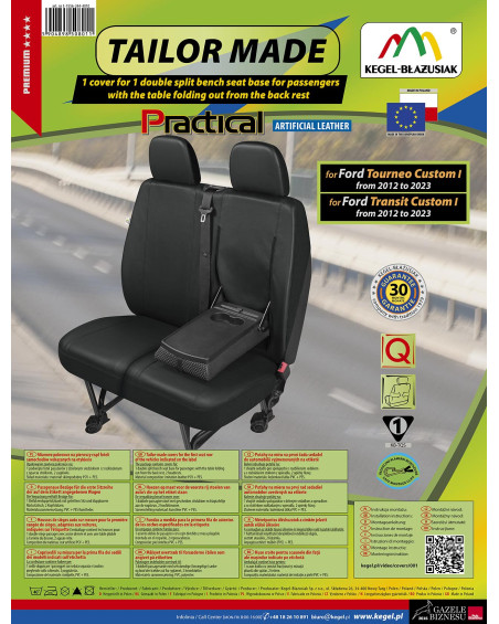 Nieprzemakalny, niebrudzący i niezwykle wytrzymały materiał zapewnia praktyczny użytek. Oferta skierowana do właścicieli samochodów dostawczych i mikrobusów, którzy chcą zadbać o wnętrze swoich pojazdów oraz dodać im szyku i elegancji. Czarna, uniwersalna kolorystyka idealnie dopasowuje się do wnętrza każdego pojazdu. Pokrowce świetnie prezentują się w każdym samochodzie. Są wyjątkowo eleganckie, dlatego też dzięki nim każde wnętrze nabierze klasy i wdzięku. Pokrowce wyposażone są w niezbędne, zapinane otwory umożliwiające założenie pokrowca bez konieczności wyciągania zagłówków i wykonywania dodatkowych otworów. Przystosowane do samochodów posiadających pełny pas bezpieczeństwa, wychodzący z podwójnej kanapy pasażerów. Komplet wyposażony jest w specjalne klamerki montażowe, a do materiału wszyte są mocowania, dlatego tez bardzo łatwo go założyć. Wszelkie zabrudzenia pokrowca, są bardzo łatwe do usunięcia- wystarczy przetrzeć je wilgotną ścierką. Produkt renomowanej firmy Kegel-Błażusiak. Największego producenta i eksportera w branży pokrowców samochodowych i odzieży roboczej. Lata doświadczenia i coraz bardziej doskonały asortyment sprawiają, że pokrowce tejże marki można określić mianem najlepszych w Polsce. Produkowany w Polsce, głównie z polskich surowców z zachowaniem wszystkich standardów jakościowych Unii Europejskiej. Kupując pokrowce Kegel-Błażusiak wspierasz polską gospodarkę i chronisz polskie miejsca pracy.