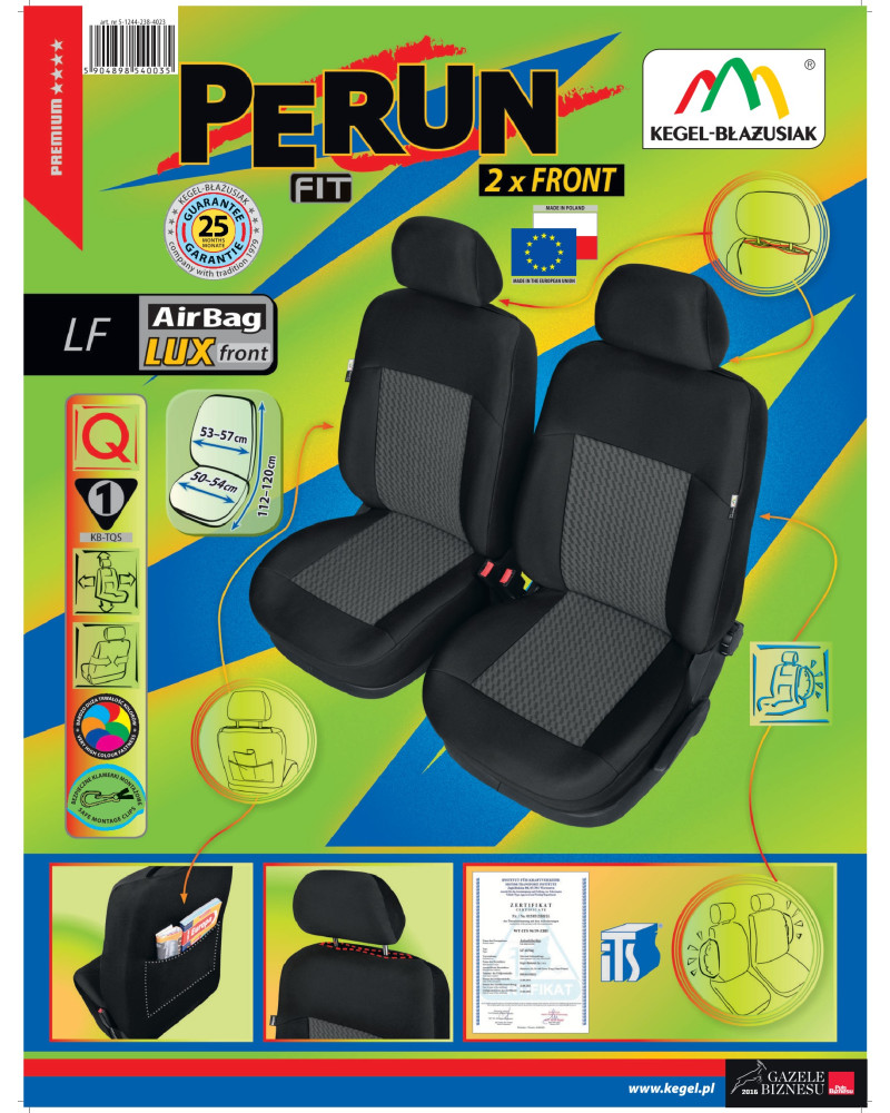 Pokrowce posiadają specjalne, bezpieczne szwy dla poduszek AirBag, dzięki czemu przystosowane są do samochodów zarówno z bocznymi poduszkami powietrznymi w fotelach, jak i do standardowych siedzeń. Profesjonalne wykonanie oraz bezpieczeństwo użytkowania potwierdzają certyfikat oraz badania przeprowadzone przez Instytut Transportu Samochodowego.