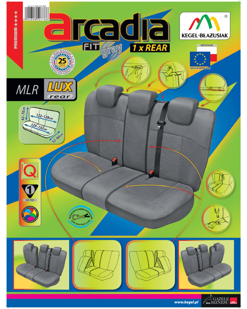 Przy produkcji pokrowców został zastosowany system dzielenia tylnej kanapy, umożliwiający złożenie jej, bez konieczności rozpinania pokrowca, trwałe jej dzielenie w proporcjach 1/3 i 2/3 lub 2/3 i 1/3 oraz rozłożenie podłokietnika w środkowej części kanapy. Pokrowce wyposażone są w elegancko wykończone otwory pod zagłówki, otwory pod wszystkie pasy bezpieczeństwa (także trzeci, środkowy) oraz gniazda pasów Do pokrowca na tylną kanapę dołączone jest pięć pokrowców na zagłówki – 2 pokrowce na zagłówki o klasycznym kształcie i 3 pokrowce na zagłówki „płaskie”. Klient wybiera 3 odpowiednie do jego samochodu, a 2 pozostawia sobie w zapasie.