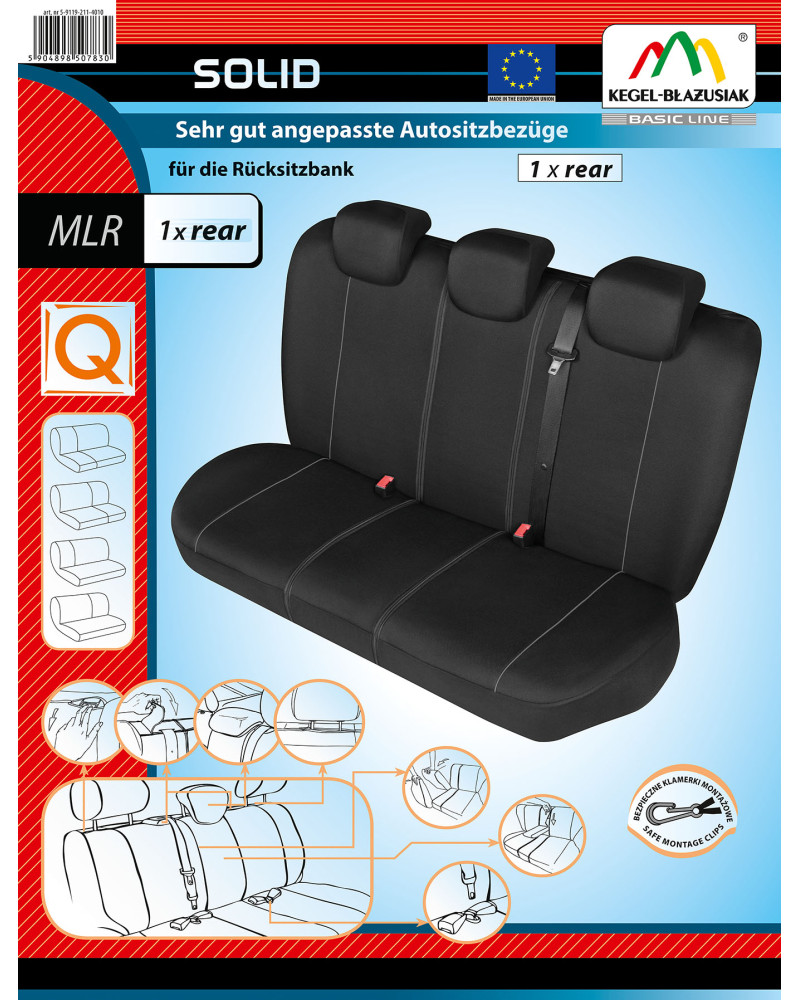 Pokrowce SOLID oferujemy w bardzo atrakcyjnej cenie. Warto jednak wspomnieć, że jakością wykonania w niczym nie ustępują modelom droższym. Są to najbardziej funkcjonalne i dopasowane pokrowce samochodowe, dostępne na rynku polskim w tej klasie cenowej. Zostały starannie zaprojektowane i wszechstronnie przetestowane, dlatego pasują na konkretne siedzenia samochodów, niemal tak, jak pokrowce miarowe - dobrze dopasowują się do foteli i kanap, oddając większość ich detali. Wszystkie elementy konstrukcyjne zostały starannie przygotowane i dobrze wykończone. Dzięki zapinanym na rzep rozcięciom, umożliwiającym założenie ich, bez konieczności wyciągania zagłówków, bardzo łatwo można je założyć. Komplet wyposażony jest w specjalne klamerki, a do materiału wszyte są mocowania, co przy pomocy dołączonej obrazkowej instrukcji obsługi zapewnia bardzo łatwy montaż.