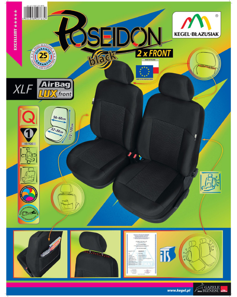 Zaletą pokrowców POSEIDON jest to, że zakrywają całą tylną powierzchnię oparcia. Ta właściwość sprawia, że bardzo dobrze prezentują się także z tyłu fotela, jednocześnie chroniąc go przed zabrudzeniami i uszkodzeniami (ważne jest to szczególnie dla osób posiadających małe dzieci). Z tyłu pokrowca dla pasażera jest dodatkowo wszyta kieszeń, pozwalająca na przechowywanie drobiazgów. Pokrowce łatwo utrzymać w czystości, gdyż można je wyprać zgodnie z informacją na metce- w temperaturze 40°. Komplet wyposażony jest w specjalne klamerki, a do materiału wszyte są mocowania, co przy pomocy dołączonej obrazkowej instrukcji obsługi zapewnia bardzo łatwy montaż. Pokrowce bardzo dobrze chronią oryginalne poszycie tapicerki przed wszelkiego rodzaju zabrudzeniami i większością uszkodzeń, gdyż materiał wykonania jest niezwykle mocny i wytrzymały odporny na przecieranie i rozrywanie. Elegancka, klasyczna kolorystyka, bardzo dobrze prezentuje się we wnętrzu każdego pojazdu. Jeżeli chcesz odświeżyć wnętrze Twojego samochodu, jeżeli chcesz dodać mu szyku i elegancji- trafiłeś na odpowiedni produkt. Produkt znanej i niezwykle cenionej w branży pokrowców samochodowych i odzieży roboczej firmy Kegel-Błażusiak. Produkowany w Polsce, głównie z polskich surowców z zachowaniem wszystkich standardów jakościowych Unii Europejskiej. Lata doświadczenia i coraz bardziej doskonały asortyment sprawia, że pokrowce tejże marki można określić mianem najlepszych w Polsce. Pokrowiec POSEIDON mimo zastosowania drogich, wysokiej jakości materiałów oferujemy w bardzo atrakcyjnej cenie.