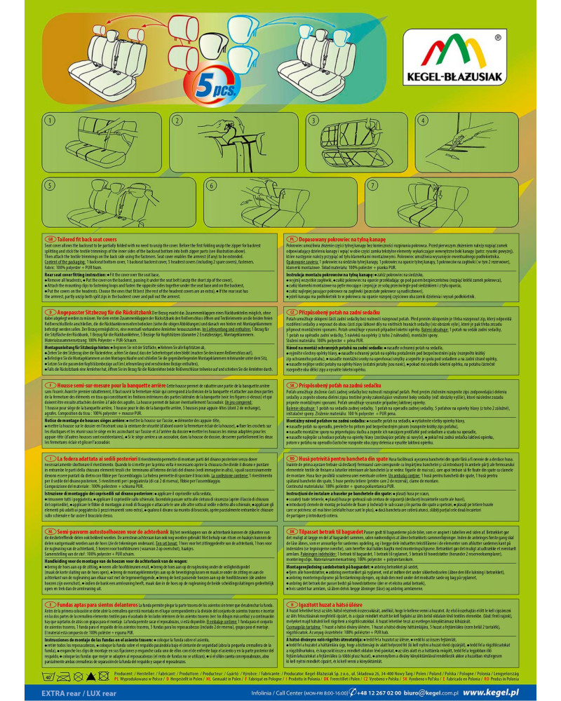 Przy produkcji pokrowców został zastosowany system dzielenia tylnej kanapy, umożliwiający złożenie jej, bez konieczności rozpinania pokrowca, trwałe jej dzielenie w proporcjach 1/3 i 2/3 lub 2/3 i 1/3 oraz rozłożenie podłokietnika w środkowej części kanapy. Pokrowce wyposażone są w elegancko wykończone otwory pod zagłówki, otwory pod wszystkie pasy bezpieczeństwa (także trzeci, środkowy) oraz gniazda pasów Do pokrowca na tylną kanapę dołączone jest pięć pokrowców na zagłówki – 2 pokrowce na zagłówki o klasycznym kształcie i 3 pokrowce na zagłówki „płaskie”. Klient wybiera 3 odpowiednie do jego samochodu, a 2 pozostawia sobie w zapasie.