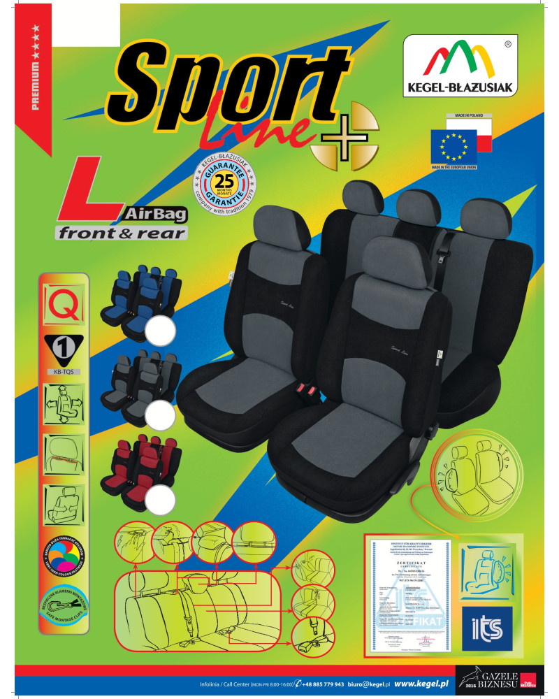 Elegancja i sportowy wygląd to dwie podstawowe cechy, wyróżniające uniwersalne, dopasowane pokrowce linii SPORT LINE. Wykonane w trzech wariantach kolorystycznych – niebieskim, czerwonym i grafitowym- w intensywnych aczkolwiek stonowanych odcieniach barw. Pokrowce skierowane do konkretnych modeli samochodów dopasowują się do siedzeń i przylegają do nich- dobrą przyczepność zapewnia podlaminowanie pianką poliuretanową od strony wewnętrznej. Pokrowce posiadają specjalne, bezpieczne szwy dla poduszek AirBag, dzięki czemu przystosowane są do samochodów zarówno z bocznymi poduszkami powietrznymi w fotelach, jak i do standardowych siedzeń. Bezpieczeństwo użytkowania potwierdzają certyfikat oraz badania przeprowadzone przez Instytut Transportu Samochodowego. Pokrowce bardzo łatwe w montażu i czyszczeniu. Sportowe oblicze luksusu. Udzielana na 25-miesięcy gwarancja da Ci pewność, że kupujesz produkt najwyższej jakości.