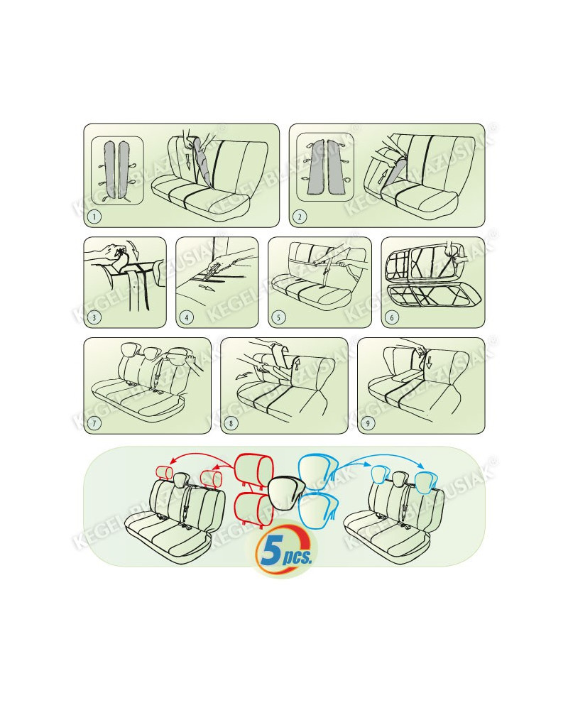 Produkt sprzedawany w kompletach. W jego skład wchodzą dwa pokrowce na przednie fotele- zabudowane z tyłu, dzięki czemu świetnie prezentują się także od strony tylnej; pokrowiec na kanapę- wyposażony w zapinane na zamek rozcięcia, pozwalające na montaż pokrowca także w przypadku dzielonej tylnej kanapy; pięć pokrowców na zagłówki oraz klamerki montażowe. Dzięki specjalnym, plastikowym klamerkom, wszytym do materiału mocowaniom oraz obrazkowej instrukcji obsługi, montaż pokrowców jest bardzo łatwy. Pokrowce wyposażone są w niezbędne, zapinane otwory, umożliwiające założenie ich bez konieczności wyciągania zagłówków i wykonywania dodatkowych otworów. Pokrowce można bez obaw prać w temperaturze 40° - zgodnie z zaleceniami na metce.