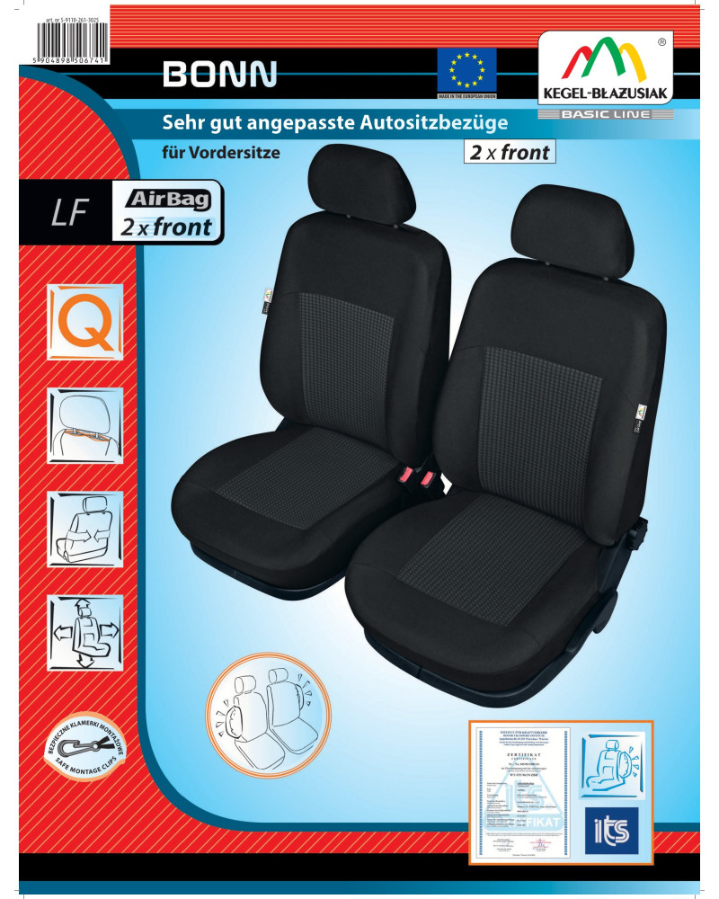 Pokrowce uniwersalne dopasowane BONN to bardzo atrakcyjne i eleganckie pokrowce, które możesz nabyć za naprawdę niską cenę. Wyposażone w specjalne, atestowane szwy dla AirBag, rozrywające się podczas wybuchu bocznych poduszek powietrznych. Dzięki odpowiedniej budowie, oraz laminacji po wewnętrznej stronie pianką PUR, dobrze przyczepiają się do właściwej tapicerki foteli. Zrobione z myślą o konkretnych modelach samochodów, dobrze dopasowują się do foteli, a ponadto zapewniają komfort użytkowania. Wykonane z mocnego, trwałego materiału żakardowego, gwarantują naprawdę długi czas użytkowania. Jeżeli chcesz odświeżyć wnętrze Twojego samochodu lub też dodać mu szyku i elegancji- trafiłeś idealnie.