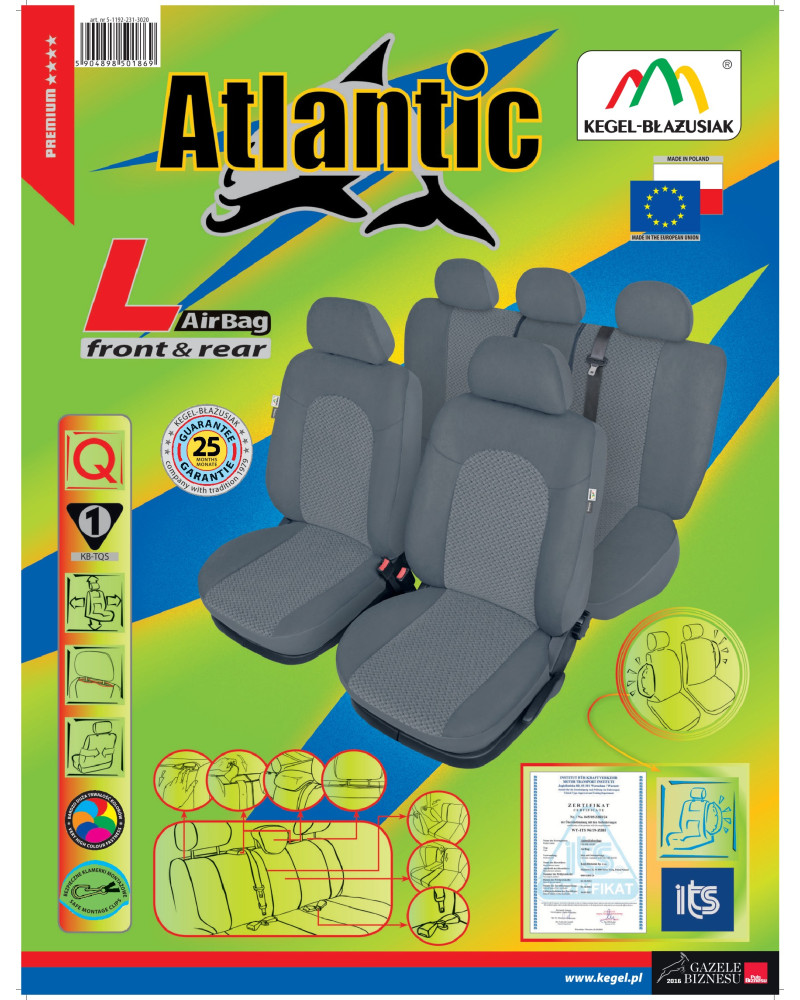 Pokrowce ATLANTIC są niezwykle trwałe i wytrzymałe- odporne na przecieranie i rozrywanie. Chronią tapicerkę samochodu przed zabrudzeniem i zniszczeniem. Zrobione z materiału welurowego wysokiej jakości- znakomicie prezentują się we wnętrzu pojazdu. Pewne partie materiału są jednolicie szare, inne natomiast- te środkowe- popielate, zdobione delikatną kratką. Budowa pokrowców, pozwala na założenie ich bez konieczności wyciągania zagłówków; poprzez pełną zabudowę zapewnia ochronę również tylnej części foteli; daje też możliwość dzielenia zarówno siedziska jak i oparcia kanapy. Pokrowce przeznaczone są do nowych modeli samochodów, które posiadają pięć zagłówków oraz trzeci pas bezpieczeństwa, wychodzący z oparcia tylnej kanapy.