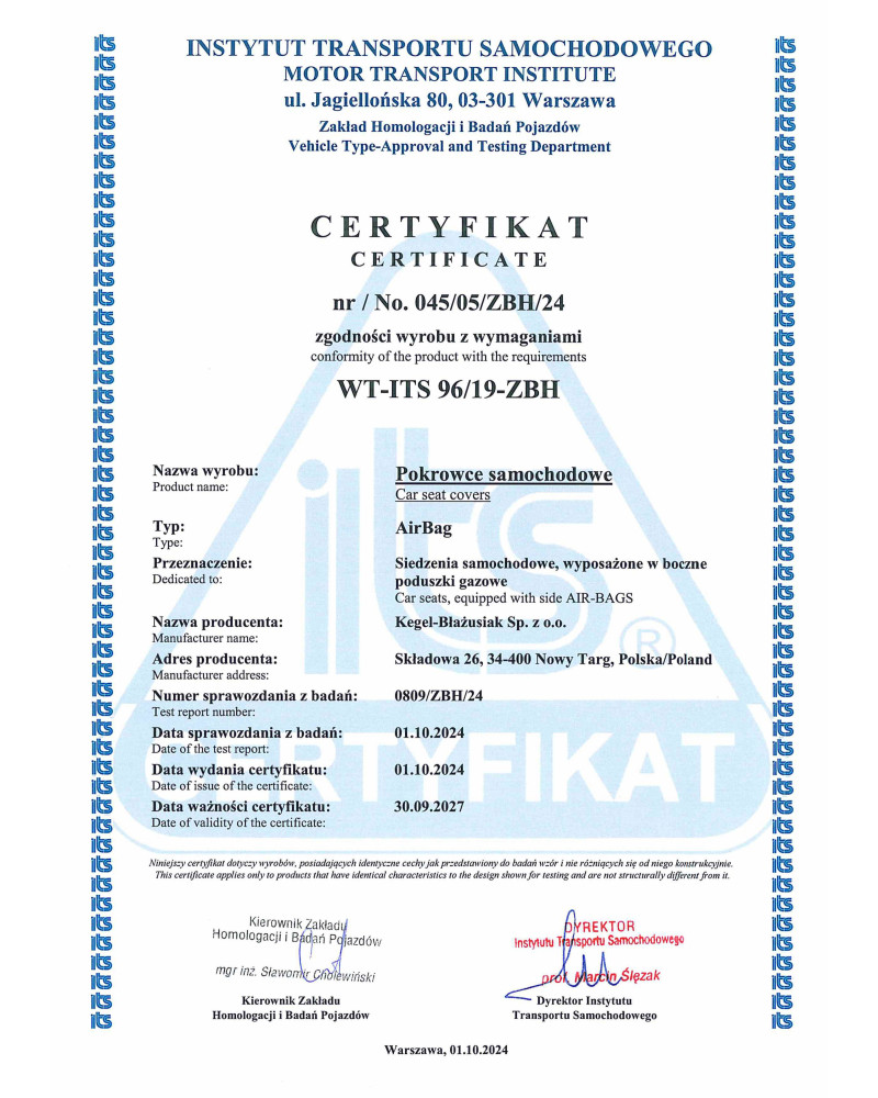 Bezpieczeństwo naszych pokrowców potwierdzają certyfikat oraz badania przeprowadzone przez Instytut Transportu Samochodowego