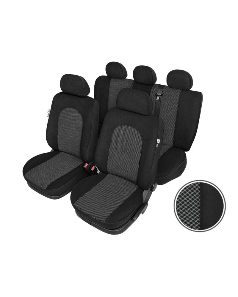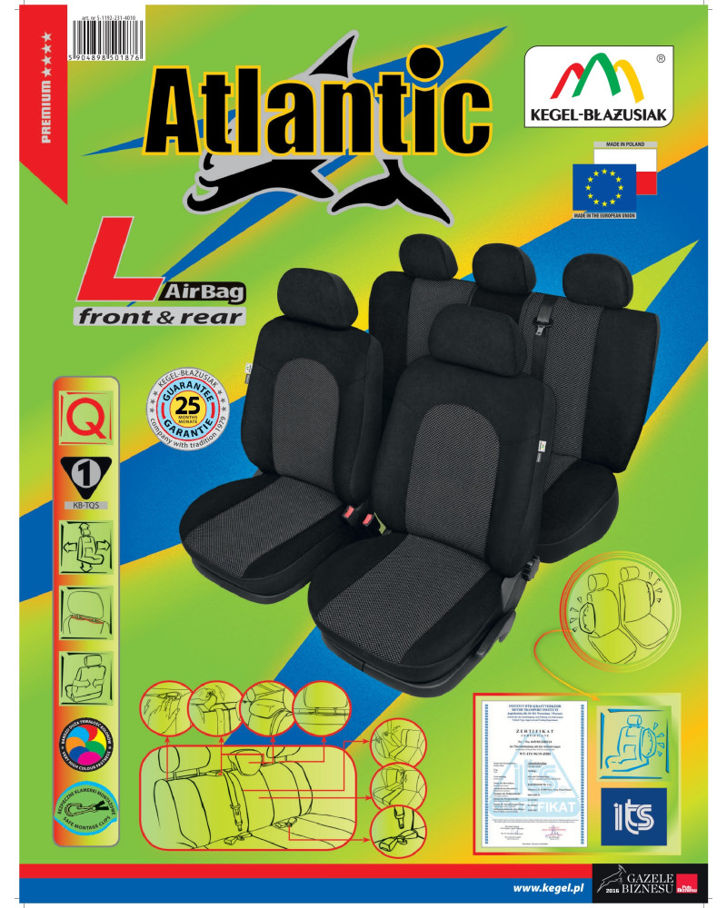Pokrowce ATLANTIC są niezwykle trwałe i wytrzymałe- odporne na przecieranie i rozrywanie. Chronią tapicerkę samochodu przed zabrudzeniem i zniszczeniem. Zrobione w większości z materiału żakardowego wysokiej jakości- znakomicie prezentują się we wnętrzu pojazdu. Pewne partie materiału są jednolicie czarne, inne natomiast- te środkowe- zdobione delikatną kratką. Budowa pokrowców, pozwala na założenie ich bez konieczności wyciągania zagłówków; poprzez pełną zabudowę zapewnia ochronę również tylnej części foteli; daje też możliwość dzielenia zarówno siedziska jak i oparcia kanapy. Pokrowce przeznaczone są do nowych modeli samochodów, które posiadają pięć zagłówków oraz trzeci pas bezpieczeństwa, wychodzący z oparcia tylnej kanapy.