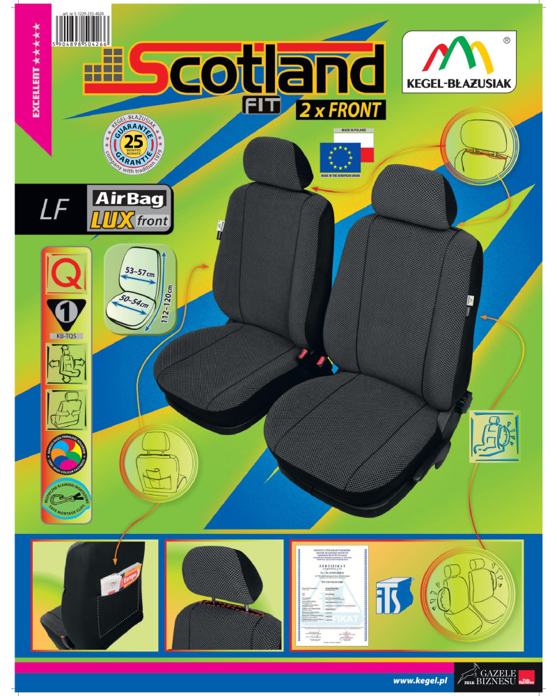 Pokrowce dopasowane SCOTLAND - zapewnią użytkującym zarówno bezpieczeństwo, jak i komfort użytkowania. Wykonane z najwyższej klasy mocnego i trudnopalnego materiału wywołują niezwykłe wrażenia estetyczne, jednocześnie chroniąc tapicerkę Twojego samochodu przed uszkodzeniami i zabrudzeniem. Szyte do konkretnych modeli samochodów z uwzględnieniem wszelkich elementów konstrukcyjnych, zapewniają bardzo dobre dopasowanie. Materiał tapicerski, z którego wykonane są pokrowce, spełnia najwyższe normy wytrzymałościowe- jest mocny, trwały. Utrzymane w ciemnej, stonowanej kolorystyce, świetnie prezentują się we wnętrzu każdego pojazdu. Gustowny, biały wzór na czarnym materiale dodaje im szyku i elegancji. Nowatorska konstrukcja i miarowość sprawiają, że pokrowce dobrze dopasowują się do foteli określonych modeli samochodów a dzięki laminacji pianką PUR charakteryzują się wysoką przyczepnością. Wzbogać wnętrze swojego samochodu o produkt najwyższej jakości.