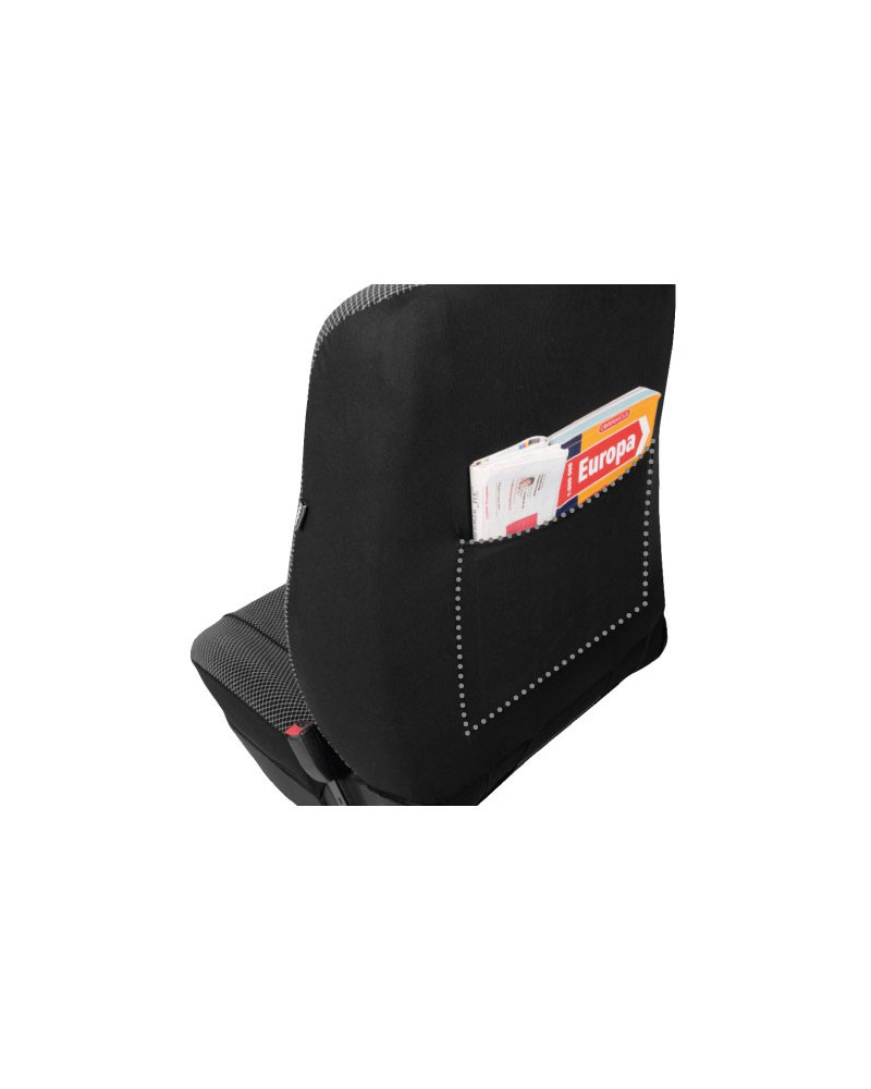 Pokrowce wyposażone są w niezbędne, zapinane na rzep rozcięcia, umożliwiające założenie ich, bez konieczności wyciągania zagłówków. Pokrowce są z tyłu zabudowane, dzięki czemu chroniona jest nie tylko przednia tapicerka ale również całe tylne oparcie fotela. Jest to udogodnienie szczególnie dla posiadaczy dzieci. Z tyłu pokrowca na fotel dla pasażera wszyta jest kieszeń, która może być niezwykle użyteczna.