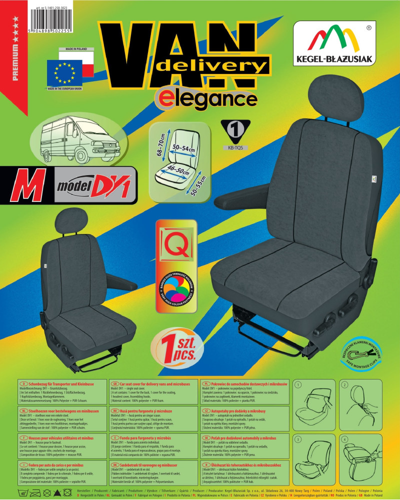 Pokrowce zostały uszyte na miarę do pewnego typu samochodów i wszechstronnie przetestowane. Wykonane z wysokogatunkowych materiałów najwyższej jakości. Materiał, z którego zostały wykonane pokrowce to swego rodzaju tkanina obiciowa, odporna na przecieranie i rozrywanie. Pokrowce zostały podlaminowane pianką samogasnącą. Pokrowce samochodowe ELEGANCE charakteryzuje estetyczne i staranne wykonanie oraz dokładne wykończenie. Dzięki nim oryginalna tapicerka samochodu zostanie przez dłuższy czas w dobrym stanie. Tkanina posiada bardzo dobrą trwałość kolorów. Pokrowce łatwo utrzymać w czystości, gdyż można je wyprać zgodnie z informacją na metce informacyjnej – w temperaturze 40°. Pokrowce bardzo łatwo można założyć na siedzenia. Komplet wyposażony jest w specjalne klamerki, a do materiału wszyte są mocowania, co przy pomocy dołączonej obrazkowej instrukcji obsługi zapewnia bardzo łatwy montaż. Można go stosować zarówno na prawy jak i lewy fotel samochodowy.