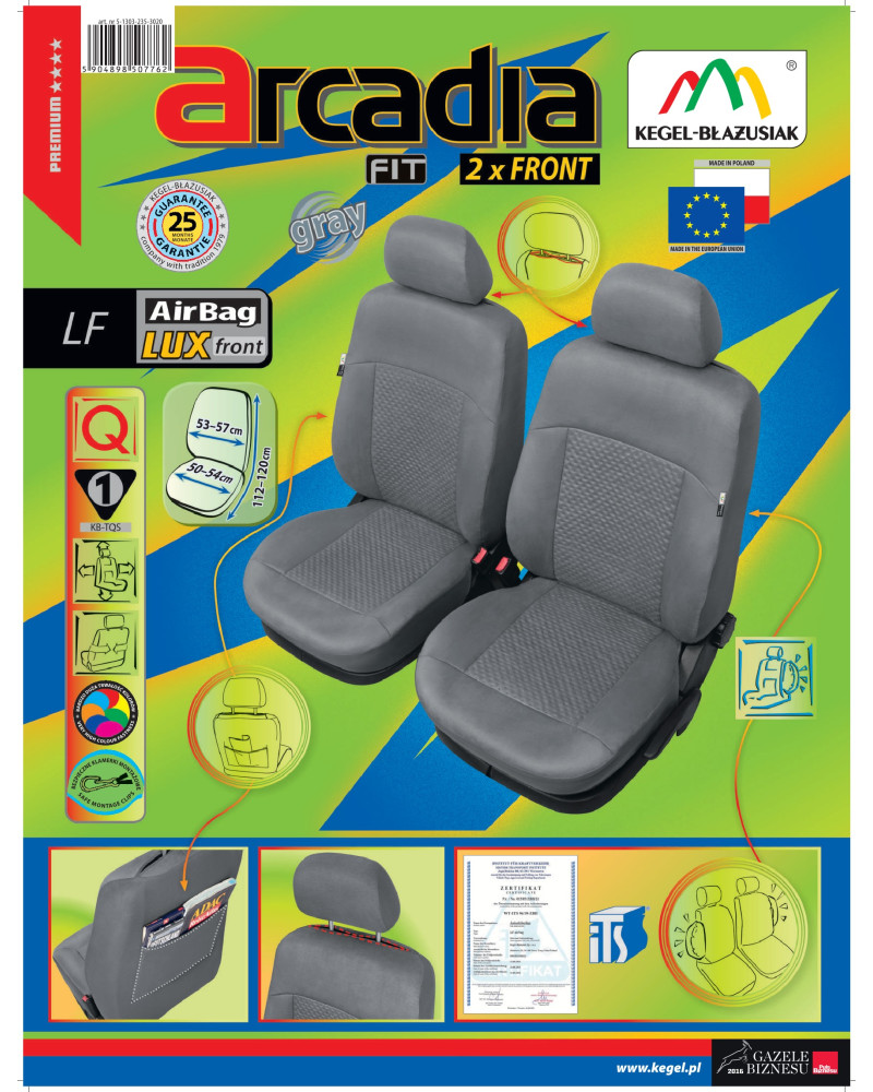 Pokrowce posiadają specjalne, bezpieczne szwy dla poduszek AirBag, dzięki czemu przystosowane są do samochodów zarówno z bocznymi poduszkami powietrznymi w fotelach, jak i do standardowych siedzeń. Profesjonalne wykonanie oraz bezpieczeństwo użytkowania potwierdzają certyfikat oraz badania przeprowadzone przez Instytut Transportu Samochodowego.