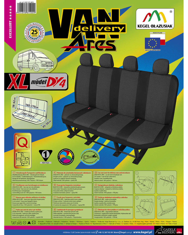 Pokrowce dopasowane ARES zostały zaprojektowane z myślą o właścicielach samochodów dostawczych i mikrobusów, chcących zadbać o wnętrza swoich pojazdów- dodać im klasy i elegancji oraz ochronić tapicerkę przed wszelkiego rodzaju zabrudzeniami i uszkodzeniami. Dzięki odpowiedniej budowie, materiał dobrze dopasowuje się do siedzeń, a podlaminowanie po wewnętrznej stronie pianką PUR, zapobiega przesuwaniu pokrowca. Pokrowce ARES spełniają najwyższe normy wytrzymałościowe. Profesjonalne wykonanie z materiałów wysokiej jakości gwarantuje długi czas użytkowania. Oferowane pokrowce z pewnością zaspokoją oczekiwania nawet najbardziej wymagających klientów. Udzielana na 25-miesięcy gwarancja da Ci pewność, że kupujesz produkt najwyższej jakości.
