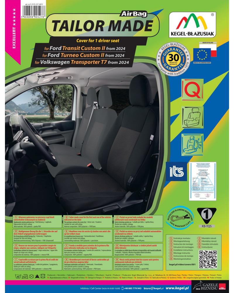 Pokrowce posiadają specjalne, bezpieczne szwy dla poduszek AirBag, dzięki czemu przystosowane są do samochodów zarówno z bocznymi poduszkami powietrznymi w fotelach, jak i do standardowych siedzeń. Profesjonalne wykonanie oraz bezpieczeństwo użytkowania gwarantują certyfikat oraz badania przeprowadzone przez Instytut Transportu Samochodowego.