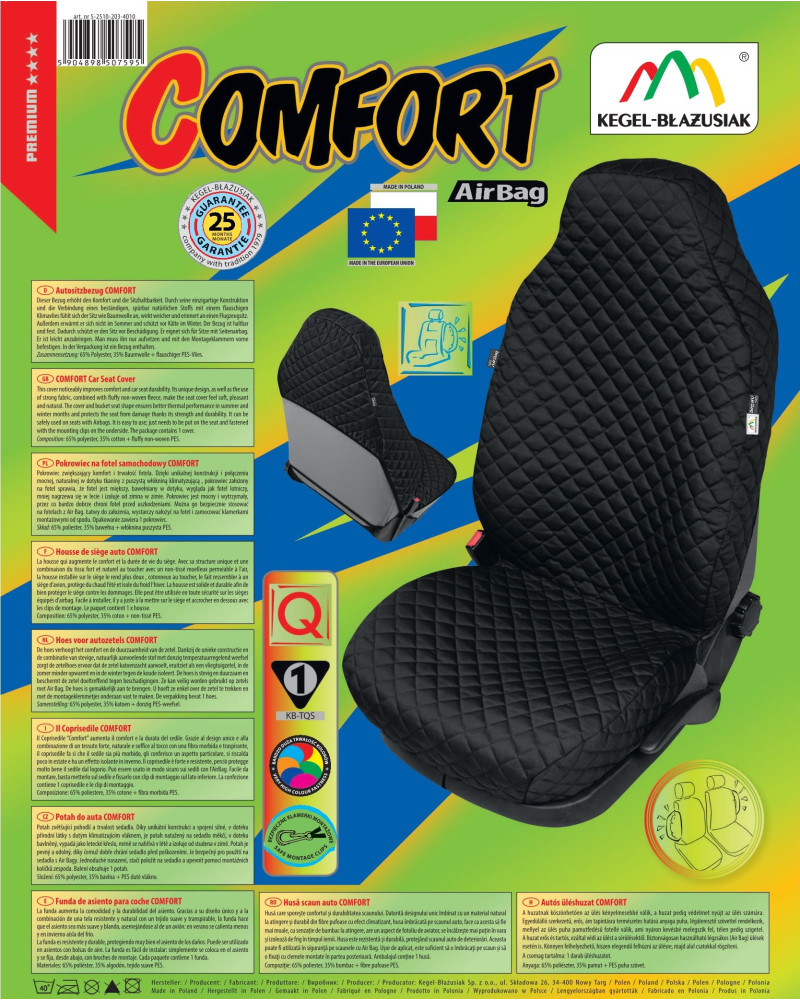 Pokrowiec COMFORT to niezwykłe połączenie naturalnej tkaniny bawełnianej, z puszystą włókniną klimatyzującą, co sprawia, że pokrowiec jest naprawdę gruby, a do tego miękki i sprężysty. Pozwala użytkownikowi zagłębić się w nim wygodnie, przez co podróż staje się znacznie przyjemniejsza. Materiał charakteryzuje się wysoką, niemal 100% trwałością koloru i odpornością na odbarwienia, przecieranie, blaknięcie. Jest mocny, trwały i wytrzymały a zarazem bardzo delikatny w dotyku niczym czysta bawełna. Pokrowiec zapewnia skuteczną izolację – słabo nagrzewa się w lecie i izoluje od zimna w zimie. Pokrowiec COMFORT skutecznie chroni fotel przed uszkodzeniem i zabrudzeniem. Pokrowiec bardzo dobrze spełnia swoją funkcję ochronną gdyż osłania cały fotel wraz z bokami i zagłówkiem. Ochrona zagłówka połączona jest z całością pokrowca, przez co po założeniu, fotel prezentuje się świetnie i wygląda niczym fotel lotniczy. Zapewnia bezpieczeństwo, gdyż przystosowany jest do foteli z bocznymi poduszkami AirBag. Może być stosowany zarówno na fotel dla kierowcy jak i pasażera, gdyż bezpieczny szew, rozrywający się podczas wybuchu poduszek Airbag jest wszyty zarówno z lewej, jak i z prawej strony. Pokrowiec wykonany jest w rozmiarze uniwersalnym, dzięki czemu pasuje na większość standardowych foteli samochodowych. Produkt bardzo łatwy w montażu i czyszczeniu.