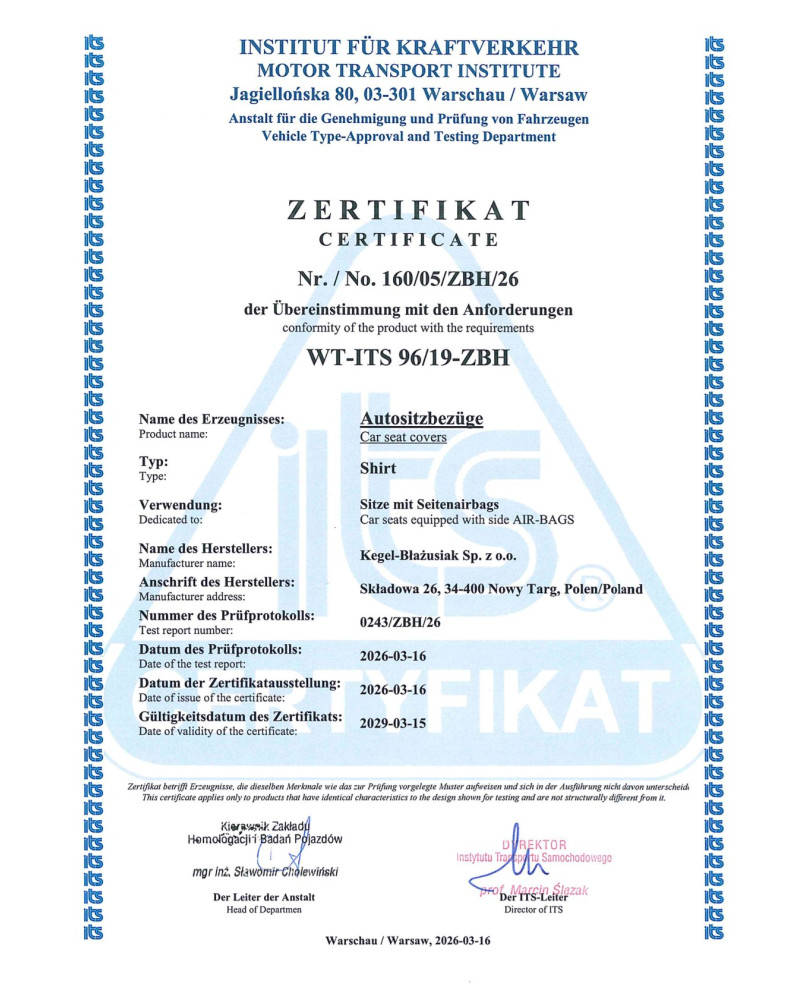 Bezpieczeństwo naszych pokrowców potwierdzają certyfikat oraz badania przeprowadzone przez Instytut Transportu Samochodowego