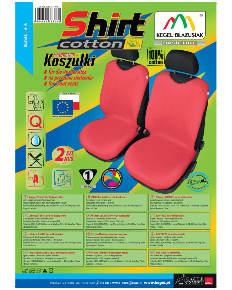 Pokrowce koszulki COTTON (teraz SHIRT COTTON- ulepszona wersja produkowanych od ponad 17 lat pokrowców koszulek) zostały wykonane z wysokogatunkowego naturalnego materiału (bawełna 100%), co w połączeniu ze starannością wykończenia nawet najdrobniejszych detali, zadowoli najbardziej wymagających klientów. Dzięki odpowiedniej budowie i nowatorskiej konstrukcji, pokrowce są dobrze dopasowane do foteli i dobrzae przylegają do nich, a podlaminowanie po wewnętrznej stronie całego materiału pianką PUR, zapobiega ich przesuwaniu. SHIRT COTTON są większe o ponad 20% od ich poprzedniej wersji, przez co znacznie lepiej pasują na fotele obecnie produkowanych samochodów. Jest to spowodowane tym, że fotele samochodów nowszych są większe od foteli samochodów sprzed 15 lat. Nową cechą pokrowców koszulek jest to, że zakrywają całą użytkową część fotela, przez co lepiej chronią fotel przed uszkodzeniami i zabrudzeniami. Nie zakrywają natomiast boków fotela, przez co mogą być bezpiecznie użytkowane na fotelach z Air Bag. Pokrowce koszulki ochronią i jednocześnie, w sposób bardzo zauważalny, odmienią fotele samochodowe, nadając autu niepowtarzalny charakter.