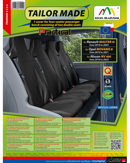 Oferta skierowana do właścicieli samochodów dostawczych i mikrobusów, którzy chcą zadbać o wnętrze swoich pojazdów oraz dodać im szyku i elegancji. Czarna, uniwersalna kolorystyka idealnie dopasowuje się do wnętrza każdego pojazdu. Pokrowce świetnie prezentują się w każdym samochodzie. Są wyjątkowo eleganckie, dlatego też dzięki nim każde wnętrze nabierze klasy i wdzięku. Pokrowce wyposażone są w niezbędne, zapinane otwory umożliwiające założenie pokrowca bez konieczności wyciągania zagłówków i wykonywania dodatkowych otworów. Przy produkcji zostały uwzględnione również inne elementy konstrukcyjne kanapy. Komplet wyposażony jest w specjalne klamerki montażowe, a do materiału wszyte są mocowania, dlatego tez bardzo łatwo go założyć. Wszelkie zabrudzenia pokrowca, są bardzo łatwe do usunięcia- wystarczy przetrzeć je wilgotną ścierką. Produkt renomowanej firmy Kegel-Błażusiak. Największego producenta i eksportera w branży pokrowców samochodowych i odzieży roboczej. Lata doświadczenia i coraz bardziej doskonały asortyment sprawiają, że pokrowce tejże marki można określić mianem najlepszych w Polsce. Produkowany w Polsce, głównie z polskich surowców z zachowaniem wszystkich standardów jakościowych Unii Europejskiej. Kupując pokrowce Kegel-Błażusiak wspierasz polską gospodarkę i chronisz polskie miejsca pracy.