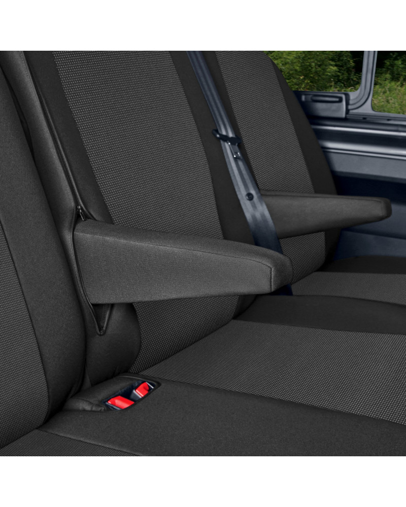 - Wyposażone w specjalne zapinane na rzepę rozcięcie, umożliwiające wyciągnięcie podłokietnika w pokrowcu na fotel dla kierowcy zarówno z prawej jak i lewej strony (wersja angielska)