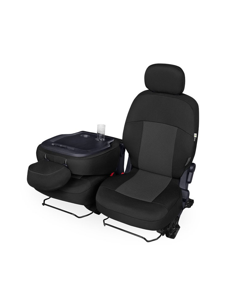 - Wyposażone w specjalne zapinane na rzepę rozcięcie, umożliwiające wyciągnięcie podłokietnika w pokrowcu na fotel dla kierowcy zarówno z prawej jak i lewej strony (wersja angielska)