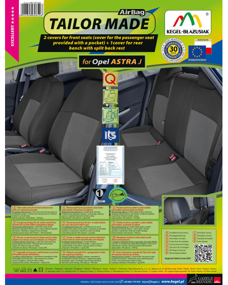 Pokrowce posiadają specjalne, bezpieczne szwy dla poduszek AirBag, dzięki czemu przystosowane są do samochodów zarówno z bocznymi poduszkami powietrznymi w fotelach, jak i do standardowych siedzeń. Profesjonalne wykonanie oraz bezpieczeństwo użytkowania gwarantują certyfikat oraz badania przeprowadzone przez Instytut Transportu Samochodowego