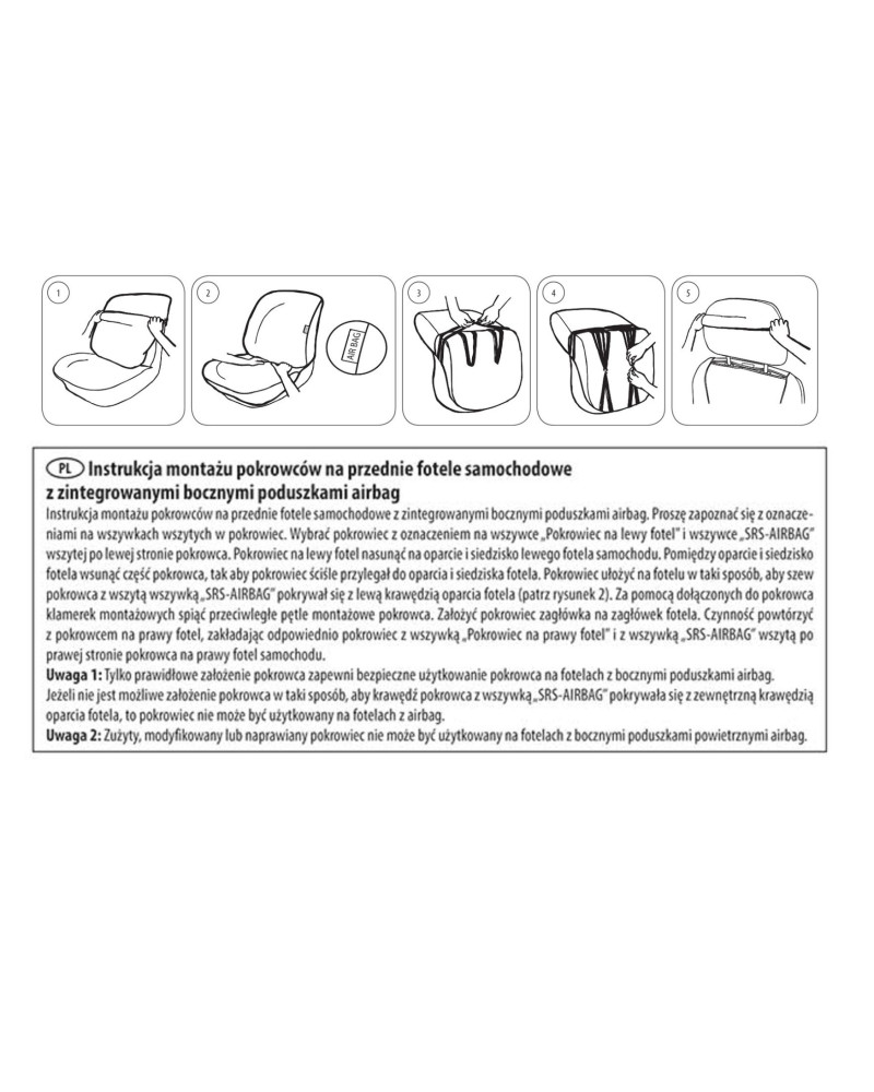 Uwaga 1: Tylko prawidłowe założenie pokrowca zapewni bezpieczne użytkowanie pokrowca na fotelach z bocznymi poduszkami airbag.