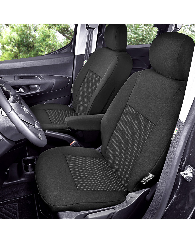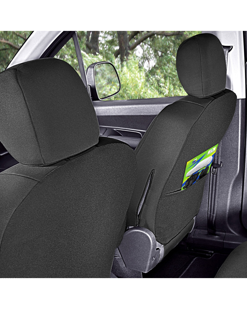 2 pokrowce na przednie fotele (pokrowce przystosowane do podłokietników zamontowanych w bocznych częściach oparcia, pokrowiec na fotel pasażera wyposażony w kieszeń)