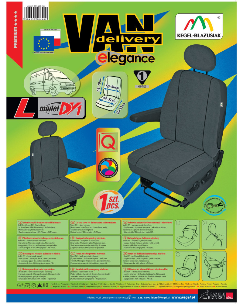 Pokrowce zostały uszyte na miarę do pewnego typu samochodów i wszechstronnie przetestowane. Wykonane z wysokogatunkowych materiałów najwyższej jakości. Materiał, z którego zostały wykonane pokrowce to swego rodzaju tkanina obiciowa, odporna na przecieranie i rozrywanie. Pokrowce zostały podlaminowane pianką samogasnącą. Pokrowce samochodowe ELEGANCE charakteryzuje estetyczne i staranne wykonanie oraz dokładne wykończenie. Dzięki nim oryginalna tapicerka samochodu zostanie przez dłuższy czas w dobrym stanie. Tkanina posiada bardzo dobrą trwałość kolorów. Pokrowce łatwo utrzymać w czystości, gdyż można je wyprać zgodnie z informacją na metce informacyjnej – w temperaturze 40°. Pokrowce bardzo łatwo można założyć na siedzenia. Komplet wyposażony jest w specjalne klamerki, a do materiału wszyte są mocowania, co przy pomocy dołączonej obrazkowej instrukcji obsługi zapewnia bardzo łatwy montaż. Można go stosować zarówno na prawy jak i lewy fotel samochodowy.