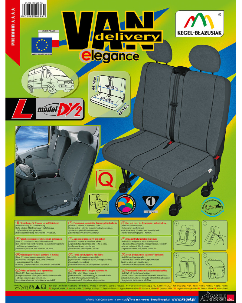 Pokrowce zostały uszyte na miarę do pewnego typu samochodów i wszechstronnie przetestowane. Wykonane z wysokogatunkowych materiałów najwyższej jakości. Materiał, z którego zostały wykonane pokrowce to swego rodzaju tkanina obiciowa, odporna na przecieranie i rozrywanie. Pokrowce zostały podlaminowane pianką samogasnącą. Pokrowce samochodowe ELEGANCE charakteryzuje estetyczne i staranne wykonanie oraz dokładne wykończenie. Dzięki nim oryginalna tapicerka samochodu zostanie przez dłuższy czas w dobrym stanie. Tkanina posiada bardzo dobrą trwałość kolorów. Pokrowce łatwo utrzymać w czystości, gdyż można je wyprać zgodnie z informacją na metce informacyjnej – w temperaturze 40°. Pokrowce bardzo łatwo można założyć na siedzenia. Komplet wyposażony jest w specjalne klamerki, a do materiału wszyte są mocowania, co przy pomocy dołączonej obrazkowej instrukcji obsługi zapewnia bardzo łatwy montaż.