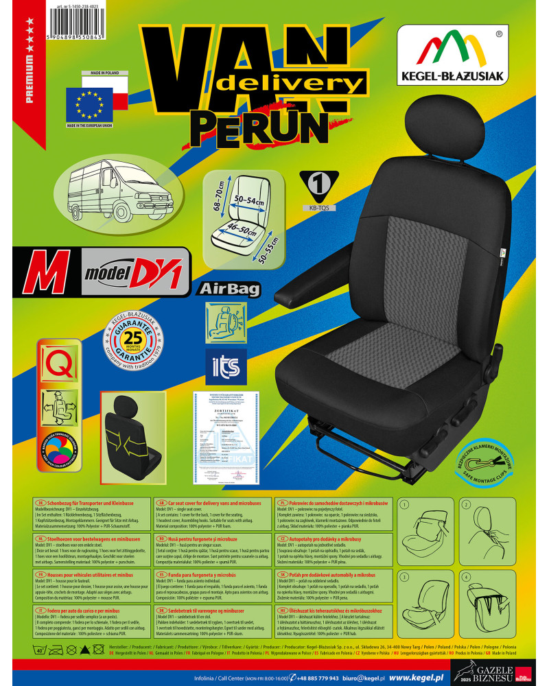 Pokrowce mają zabudowaną całą tylną powierzchnię oparcia, co ma duże znaczenie, szczególnie dla właścicieli mikrobusów. Dzięki tejże zabudowie bardzo dobrze prezentują się także z tyłu fotela, jednocześnie chroniąc go przed zabrudzeniami i uszkodzeniami. Pokrowce posiadają specjalne zapinane na rzepę rozcięcie, umożliwiające wyciągnięcie podłokietnika, jeżeli fotel samochodowy taki posiada. Pokrowce wyposażone są w niezbędne otwory umożliwiające założenie pokrowca bez konieczności wyciągania zagłówków i wykonywania dodatkowych otworów. Wszelkie rozcięcia na zagłówki, elementy konstrukcyjne czy uchwyty są dobrze przygotowane i estetycznie wykończone. Komplet wyposażony jest w specjalne klamerki, a do materiału wszyte są mocowania, co przy pomocy dołączonej obrazkowej instrukcji obsługi zapewnia bardzo łatwy montaż. Produkt firmy Kegel-Błażusiak, która jest wiodącym producentem i eksporterem w branży pokrowców samochodowych i odzieży roboczej. Produkowany w Polsce, głównie z polskich surowców z zachowaniem wszystkich standardów jakościowych Unii Europejskiej. Lata doświadczenia i coraz bardziej doskonały asortyment sprawia, że pokrowce tejże marki można określić mianem najlepszych w Polsce.