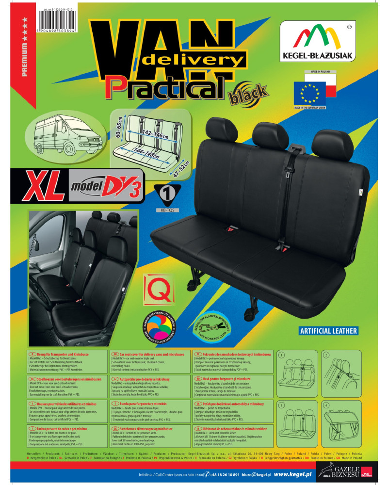 Nieprzemakalny, niebrudzący i niezwykle wytrzymały materiał zapewnia praktyczny użytek. Oferta skierowana do właścicieli samochodów dostawczych i mikrobusów, którzy chcą zadbać o wnętrze swoich pojazdów oraz dodać im szyku i elegancji. Czarna, uniwersalna kolorystyka idealnie dopasowuje się do wnętrza każdego pojazdu. Pokrowce świetnie prezentują się w każdym samochodzie. Są wyjątkowo eleganckie, dlatego też dzięki nim każde wnętrze nabierze klasy i wdzięku. Pokrowce wyposażone są w niezbędne, zapinane otwory umożliwiające założenie pokrowca bez konieczności wyciągania zagłówków i wykonywania dodatkowych otworów. Przy produkcji zostały uwzględnione również inne elementy konstrukcyjne kanapy. W pokrowcu na oparcie znajduje się zamek, który umożliwia wyciągnięcie pasa bezpieczeństwa. Tył pokrowca jest zabudowany, co pozwala chronić kanapę także od strony tylnej. Komplet wyposażony jest w specjalne klamerki montażowe, a do materiału wszyte są mocowania, dlatego tez bardzo łatwo go założyć. Wszelkie zabrudzenia pokrowca, są bardzo łatwe do usunięcia- wystarczy przetrzeć je wilgotną ścierką. Produkt renomowanej firmy Kegel-Błażusiak. Największego producenta i eksportera w branży pokrowców samochodowych i odzieży roboczej. Lata doświadczenia i coraz bardziej doskonały asortyment sprawiają, że pokrowce tejże marki można określić mianem najlepszych w Polsce. Produkowany w Polsce, głównie z polskich surowców z zachowaniem wszystkich standardów jakościowych Unii Europejskiej. Kupując pokrowce Kegel-Błażusiak wspierasz polską gospodarkę i chronisz polskie miejsca pracy.