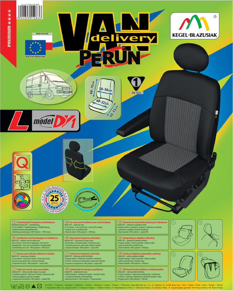 Pokrowce mają zabudowaną całą tylną powierzchnię oparcia, co ma duże znaczenie, szczególnie dla właścicieli mikrobusów. Dzięki tejże zabudowie bardzo dobrze prezentują się także z tyłu fotela, jednocześnie chroniąc go przed zabrudzeniami i uszkodzeniami. Pokrowce posiadają specjalne zapinane na rzepę rozcięcie, umożliwiające wyciągnięcie podłokietnika, jeżeli fotel samochodowy taki posiada. Pokrowce wyposażone są w niezbędne otwory umożliwiające założenie pokrowca bez konieczności wyciągania zagłówków i wykonywania dodatkowych otworów. Wszelkie rozcięcia na zagłówki, elementy konstrukcyjne czy uchwyty są dobrze przygotowane i estetycznie wykończone. Komplet wyposażony jest w specjalne klamerki, a do materiału wszyte są mocowania, co przy pomocy dołączonej obrazkowej instrukcji obsługi zapewnia bardzo łatwy montaż. Produkt firmy Kegel-Błażusiak, która jest wiodącym producentem i eksporterem w branży pokrowców samochodowych i odzieży roboczej. Produkowany w Polsce, głównie z polskich surowców z zachowaniem wszystkich standardów jakościowych Unii Europejskiej. Lata doświadczenia i coraz bardziej doskonały asortyment sprawia, że pokrowce tejże marki można określić mianem najlepszych w Polsce.