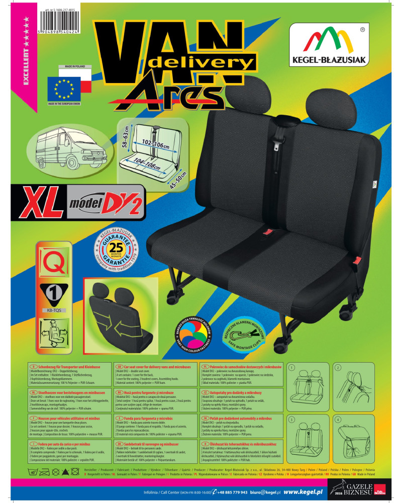 Zaletą pokrowców ARES jest to, że zakrywają całą tylną powierzchnię oparcia, co sprawia, że bardzo dobrze prezentują się także z tyłu fotela, jednocześnie chroniąc go przed zabrudzeniami i uszkodzeniami. Pokrowce wyposażone są w niezbędne, zapinane otwory umożliwiające założenie pokrowca bez konieczności wyciągania zagłówków i wykonywania dodatkowych otworów. Przystosowane są do samochodów posiadających pełny pas bezpieczeństwa, wychodzący z podwójnej kanapy pasażerów. Komplet wyposażony jest w specjalne klamerki, a do materiału wszyte są mocowania, co przy pomocy dołączonej obrazkowej instrukcji obsługi zapewnia bardzo łatwy montaż. Pokrowce można bez obaw prać w temperaturze 40° - zgodnie z zaleceniami na metce. Produkt renomowanej firmy Kegel- Błażusiak. Największego producenta i eksportera w branży pokrowców samochodowych i odzieży roboczej. Produkowany w Polsce, głównie z polskich surowców z zachowaniem wszystkich standardów jakościowych Unii Europejskiej. Kupując pokrowce Kegel-Błażusiak wspierasz polską gospodarkę i chronisz polskie miejsca pracy.