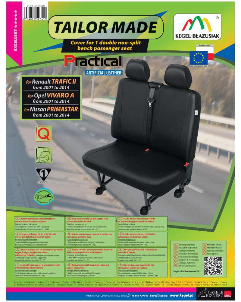 Nieprzemakalny, niebrudzący i niezwykle wytrzymały materiał zapewnia praktyczny użytek. Oferta skierowana do właścicieli konkretnych samochodów dostawczych i mikrobusów, którzy chcą zadbać o wnętrze swoich pojazdów oraz dodać im szyku i elegancji. Czarna, uniwersalna kolorystyka idealnie dopasowuje się do wnętrza każdego pojazdu. Pokrowce świetnie prezentują się w każdym samochodzie. Są wyjątkowo eleganckie, dlatego też dzięki nim każde wnętrze nabierze klasy i wdzięku. Pokrowce wyposażone są w niezbędne, zapinane otwory umożliwiające założenie pokrowca bez konieczności wyciągania zagłówków i wykonywania dodatkowych otworów. Przystosowane do samochodów posiadających pełny pas bezpieczeństwa, wychodzący z podwójnej kanapy pasażerów. Komplet wyposażony jest w specjalne klamerki montażowe, a do materiału wszyte są mocowania, dlatego tez bardzo łatwo go założyć. Wszelkie zabrudzenia pokrowca, są bardzo łatwe do usunięcia- wystarczy przetrzeć je wilgotną ścierką. Produkt renomowanej firmy Kegel-Błażusiak. Największego producenta i eksportera w branży pokrowców samochodowych i odzieży roboczej. Lata doświadczenia i coraz bardziej doskonały asortyment sprawiają, że pokrowce tejże marki można określić mianem najlepszych w Polsce. Produkowany w Polsce, głównie z polskich surowców z zachowaniem wszystkich standardów jakościowych Unii Europejskiej. Kupując pokrowce Kegel-Błażusiak wspierasz polską gospodarkę i chronisz polskie miejsca pracy.