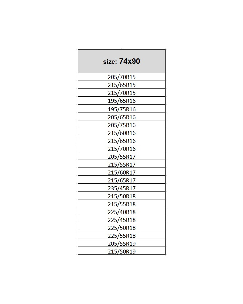 Pasuje na koła o rozmiarze: 205/70R15, 215/65R15, 215/70R15, 195/65R16, 195/75R16, 205/65R16, 205/75R16, 215/60R16, 215/65R16, 215/70R1, 205/55R17, 215/55R17, 215/60R17, 215/65R17, 235/45R17, 215/50R18, 215/55R18, 225/40R18, 225/45R18, 225/50R18, 225/55R18, 205/55R19, 215/50R19.