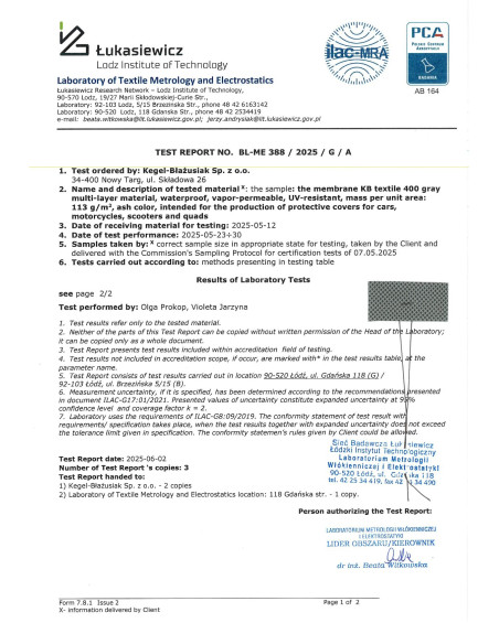Poniżej raport z badań paroprzepuszczalności membrany z której produkujemy pokrowce Optimal Garage. Badanie zostało wykonane w niezależnym labortorium badawczym. Badanie potwierdza wysoką paroprzepuszczalność i wodoszczelność membrany: przenikanie pary wodnej przez membranę pokrowca 161 gramów pary wodnej przez m² membrany w ciągu 24 godzin, wodoszczelność membrany 5350 mm słupa wody.